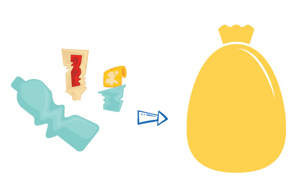 Produse care se introduc in sacul galben: recipiente/sticle din PET (suc, apa, bere, alte produse alimentare), tetrapack (cutii de lapte, de tomate, sucuri), recipiente / flacoane / forme de la produse cosmetice, detergenti, produse alimentare, folie si pungi de plastic, vase din plastic pentru flori, forme din plastic pentru produse congelate, saci din plastic, accesorii pentru haine, banda de legat pachete.